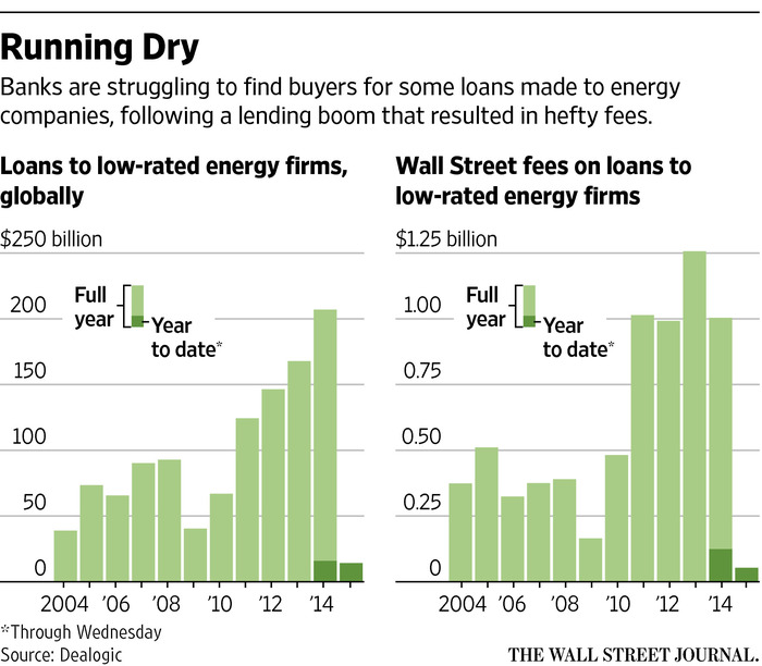 The banks intended to sell the loans to investors but have struggled to unload them even after cutting prices, thanks to a nine-month-long plunge that has taken Nymex crude futures to their lowest level since 2009.