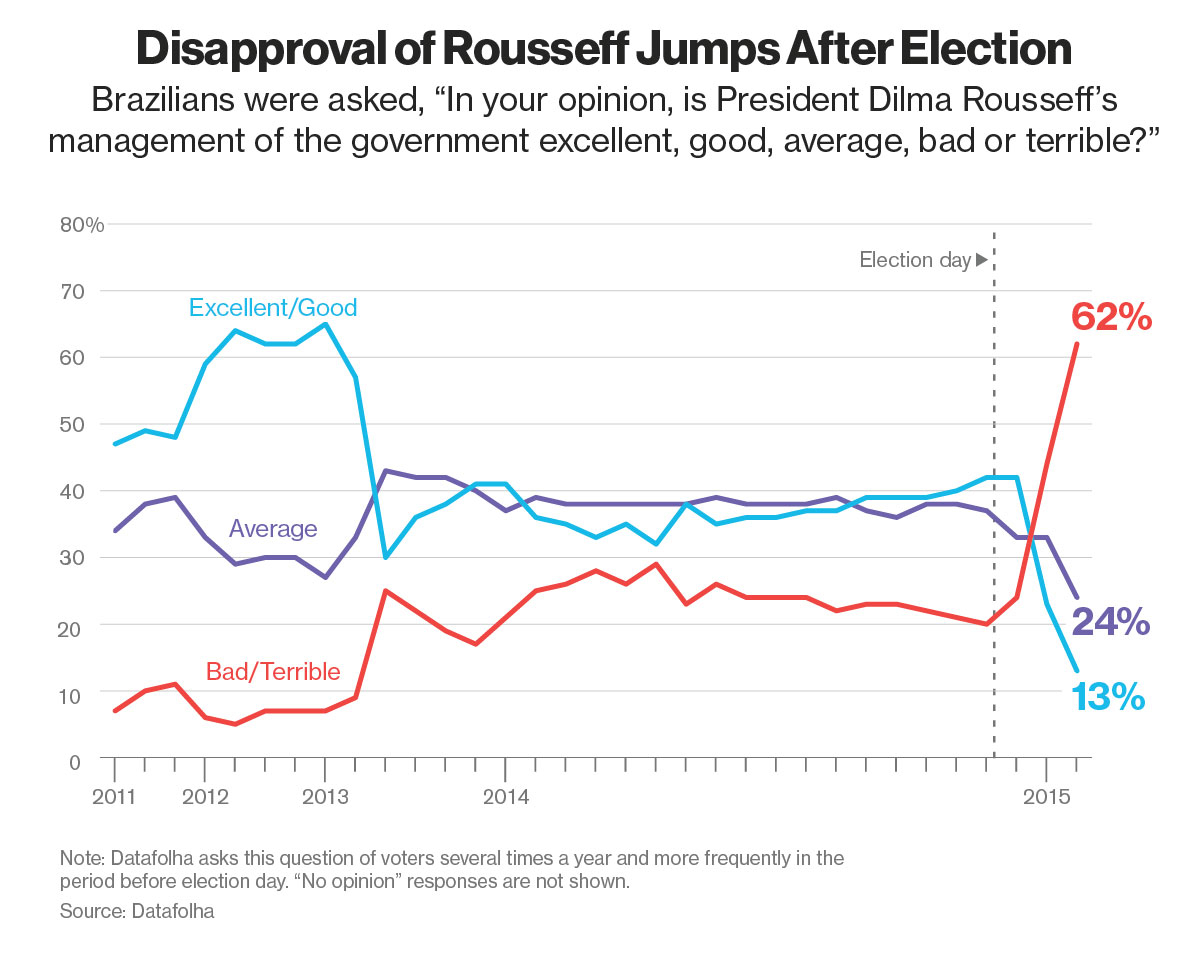 Her approval ratings have plummeted to a record 13 percent, according to a March 16-17 Datafolha poll. If new elections were to be called, Rousseff would lose with 16.6 percent against 55.7 percent for Aecio Neves, the opposition senator who lost the October vote, an MDA poll showed. She won re-election with 51.6 percent of the votes.