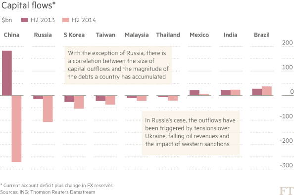 While in 2008-09 the US was a key catalyst of emerging market distress, this time China is seen as the chief bugbear. Slowing Chinese GDP growth, coupled with a slowdown in construction, is triggering a large bout of capital flight as investors think they will earn more by parking their money elsewhere.