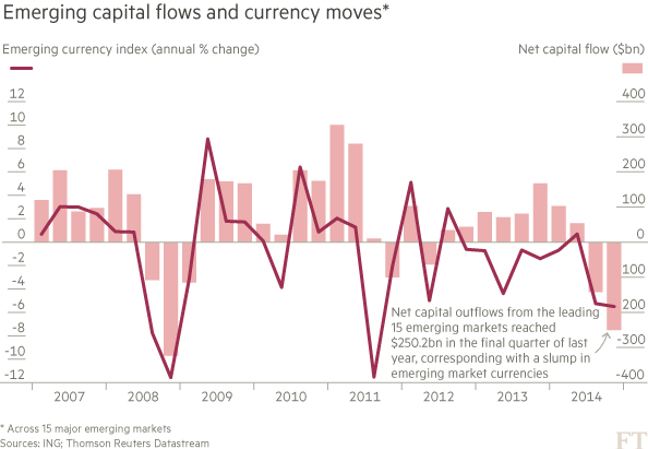 On an aggregate basis, the 15 largest emerging economies experienced their biggest absolute capital outflow since the crisis in the second half of last year, as a strong US dollar drove emerging market currencies into a swoon and investors grew nervous over the prospect of a tightening in US monetary policy, according to data compiled by ING. At the same time, low commodity prices slammed GDP growth rates across the developing world.