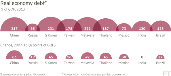 According to a study by McKinsey, total emerging market debt rose to $49tn at the end of 2013, accounting for 47 per cent of the growth in global debt since 2007. That is more than twice its share of debt growth between 2000 and 2007.