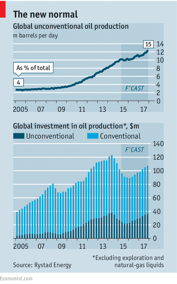 Nor is there any sign of a shift away from unconventional oil in terms of capital investment. Unconventional oil has been gaining an increasing share of the pie in recent years (see chart). Investment of all kinds will dip this year but Rystad Energy, a research firm, sees it rising strongly again thereafter. A new forecast from America’s Energy Information Administration reckons rising production and greater efficiency mean that the country will stop importing energy between 2020 and 2030, depending on the price.