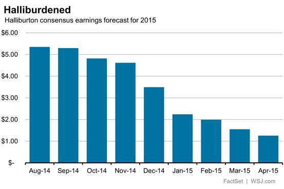 For example, in August 2014, analysts saw Halliburton earning $5.35 a share for 2015. By the beginning of November that forecast had fallen to $4.62. Today, it is even lower at $1.26.