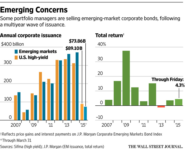 J.P. Morgan expects the default rate among emerging-market high-yield corporate issuers to reach 5.4% this year, up from 3.2% in 2014. In comparison, less than 2% of U.S. junk bonds are expected to default this year, according to Fitch Ratings Inc.