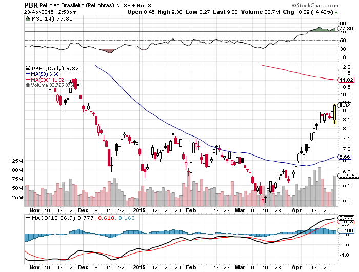 Petrobras is the little engine that could right now. Investors who bought when the guys on CNBC were telling you nobody is buying Petrobras are now up nearly 50% in just six weeks. Booyah!
