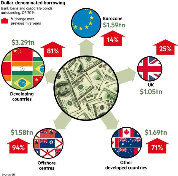 While emerging markets account for the lion’s share of borrowing, they are not alone. Global dollar credit to non-bank borrowers in the eurozone has increased from $1.3tn in late 2008 to $1.6tn at the end of September 2014, according to the Switzerland-based Bank for International Settlements, while the UK’s share has grown from $800bn to $1.05tn.