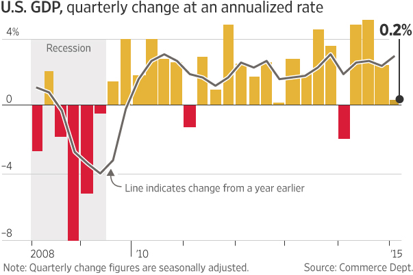 Gross domestic product, the broadest measure of goods and services produced across the economy, expanded at a 0.2% seasonally adjusted annual rate in the first quarter, theCommerce Department said Wednesday. The economy advanced at a 2.2% pace in the fourth quarter and 5% in the third.