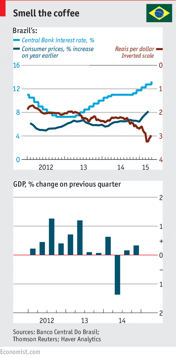 DO NOT envy Brazil’s monetary policymakers. The economy is faltering. With business confidence plumbing record depths, unemployment up and real wages down—by 3% year-on-year in March, the most in more than a decade—demand remains fragile. Supermarket sales fell by 2.6% last month, compared with the previous one. Output will probably contract by at least 1% this year. Yet with prices rising at the fastest rate since 2003, the central bank’s rate-setters had little choice when they met on April 29th but to raise interest rates by another half a percentage point, to 13.25%.