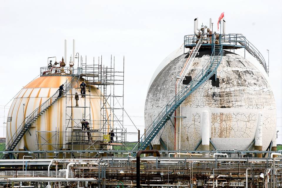 Employees work on a storage tank inside Chevron’s Richmond, Calif., refinery. PHOTO: DAVID PAUL MORRIS/BLOOMBERG NEWS