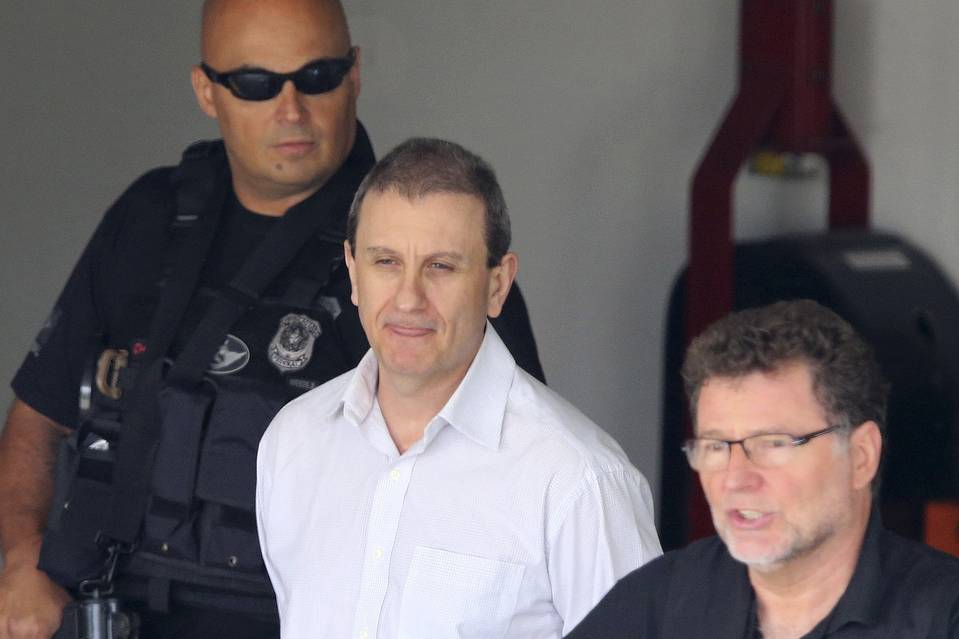 Alberto Youssef, a witness in Brazil’s investigation into alleged corruption at state-owned oil company Petrobras, is escorted by federal policemen before a hearing at the federal court in Curitiba in February. PHOTO: REUTERS