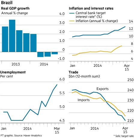 Add a corruption scandal at Petrobras, the state-controlled oil company, and an adverse external environment — the Chinese economy slowing and the US Federal Reserve expected to raise interest rates — and Latin America’s largest economy is facing difficulties.
