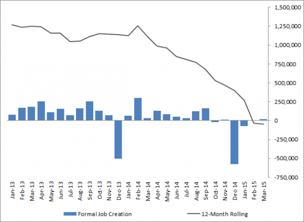Years of disappointing fixed investment growth and arguably the most aggressive monetary tightening cycle in the world, which has seen the central bank hike its benchmark Selic target rate by 600bps to 13.25 per cent since April 2013, have not prevented unemployment from reaching historically low levels. The unemployment rate ended 2014 at 4.3 per cent – a record low – before jumping sharply to 6.2 per cent by March this year. While unemployment tends to rise in the early part of the year, something is definitely going on. For the first time since the global financial crisis, we are now seeing a larger number of jobs being destroyed than created on a 12-month rolling basis. This means that adverse economic conditions, abroad and domestically, are finally catching up with employers.