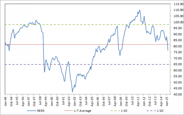 Since the onset of the US dollar bull-run in mid-2011 and the start of the gradual sell-off in the Brazilian real, the unit has depreciated from a high of R$1.53 to the dollar, to R$2.98 today. In real effective exchange rate terms, the broad index has now fallen back below its long-term average of 81.36 to 76.61 in March, according to data from the Bank of International Settlements. From a technical perspective, too, a change in trend could be forming.