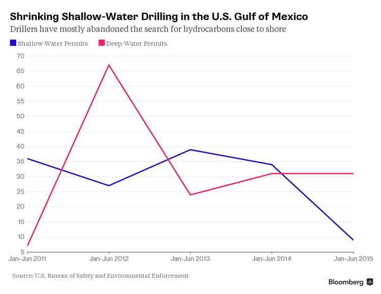 The number of permits for new wells in seas less than 500 feet (152 meters) deep plunged 74 percent to nine during the first six months of this year from a year earlier, according to the U.S. Bureau of Safety and Environmental Enforcement.