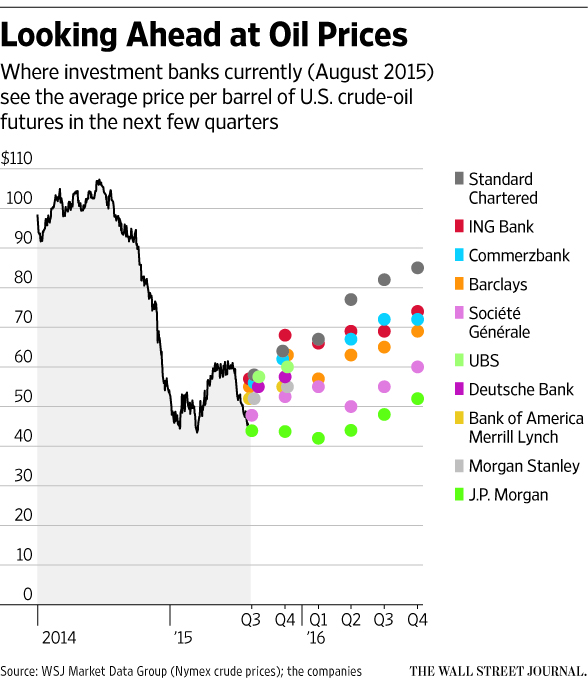 A survey of 10 investment banks by The Wall Street Journal is forecasting that the price of oil will stay below $70 a barrel until late next year. That is down from more than $100 a barrel a little over a year ago.