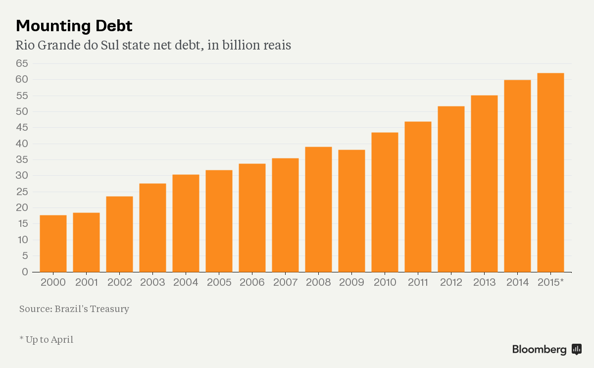 Yet that’s exactly what is happening after its southernmost state of Rio Grande do Sul defaulted on a 280 million real ($80.9 million) payment to the federal government this month — the first since the nation’s municipal-debt meltdown in 1997. The state, proportionally the most-indebted in Brazil, is in such distress that it didn’t pay salaries to public workers in July.