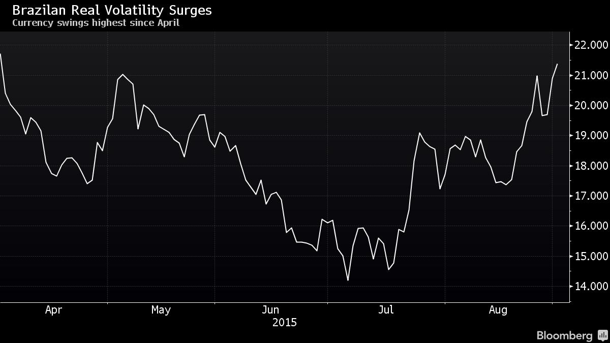 The real depreciated 1.8 percent to 3.6875 per dollar at 3:36 p.m. in Sao Paulo, the weakest level on a closing basis since December 2002. The drop was the biggest among 16 major currencies tracked by Bloomberg. One-month implied volatility on options for the real, reflecting projected shifts in the exchange rate, increased to 21 percent, the highest since April 1.