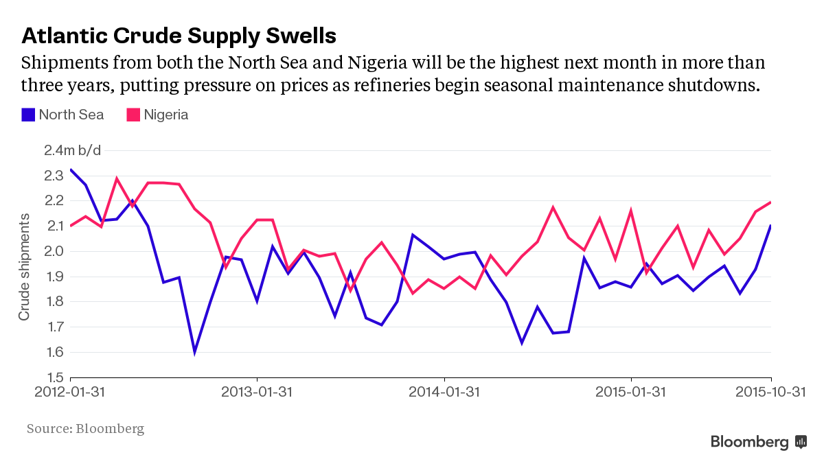 Output of North Sea grades will reach the highest since May 2012 next month, according to loading programs compiled by Bloomberg. Supplies from Nigeria, the biggest oil producer in Africa, are set to reach a level not seen since August of that year.