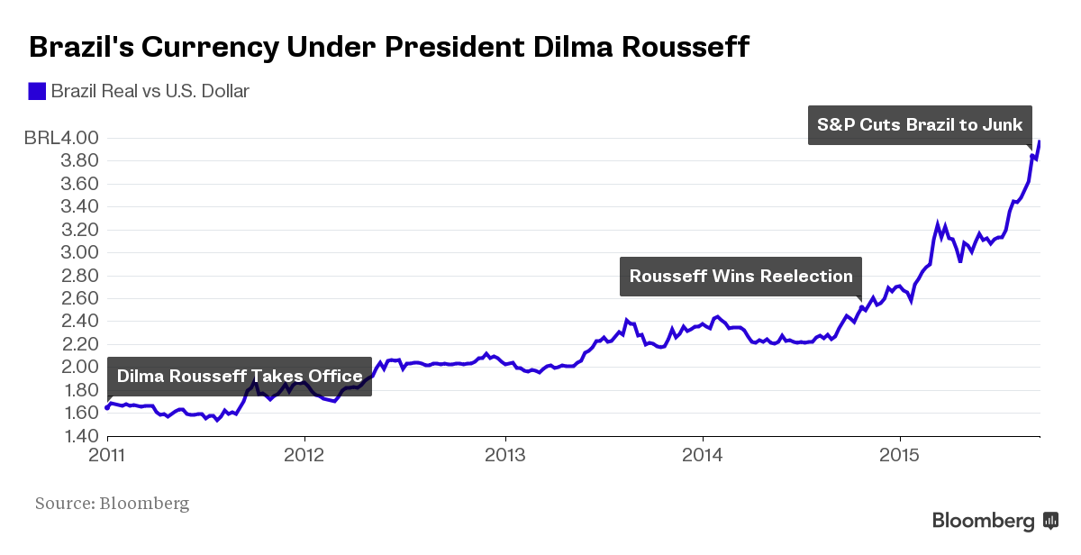 Now, Brazil is relinquishing those achievements at an alarming rate as it wilts under the growing strain of an ever-expanding corruption investigation and a recession on pace to be the worst since the Great Depression. The real has plummeted 60 percent since President Dilma Rousseff, Lula’s handpicked successor, took office in 2011. In that span, Brazil has suffered three downgrades, with Standard & Poor’s cutting the country back to junk this month.
