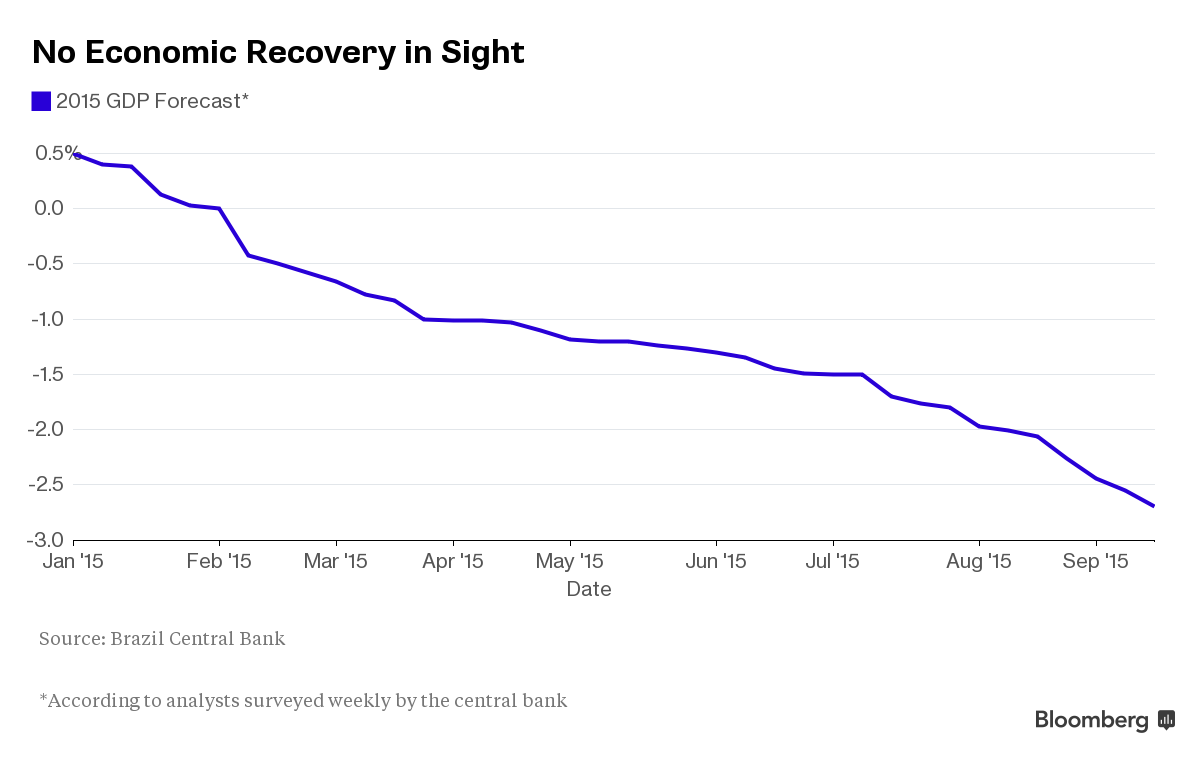 Brazil’s domestic turmoil couldn’t come at a worse time. Emerging markets around the world are declining on speculation that slowing growth in China will damage the global economy and that an increase in U.S. interest rates will lure capital away from developing nations. Still, Brazil’s decline has been more pronounced.