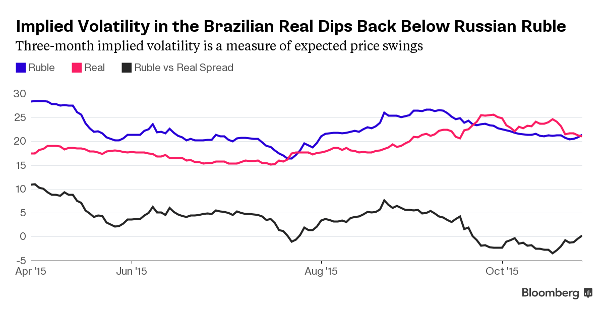 As the exchange rate slumped Wednesday, its three-month implied volatility, a measure of expectations for future price shifts, trailed that of Russia’s ruble for the first time in a month. While the gauge has surged 65 percent from this year’s low in January, it has tumbled 22 percent from its Oct. 16 peak.