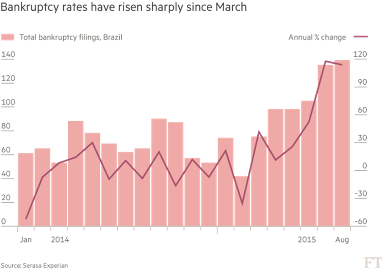 Brazil’s plunge into negativity is turning into a godsend for distressed asset hunters, arriving in search of cut-price corporate restructurings. Drawing them in is a rise in bankruptcy filings and the disposal by banks of their non-performing loan portfolios.