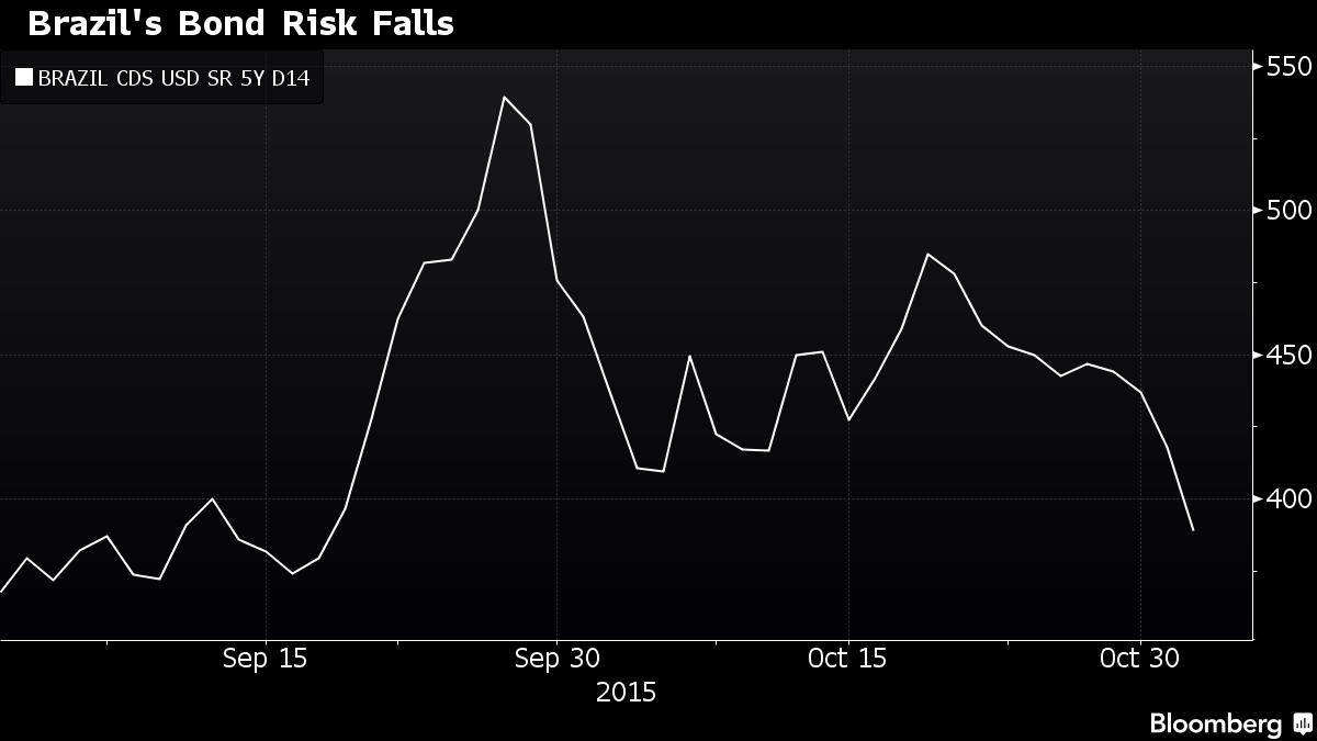 The cost of insuring Brazilian bonds for five years in the credit-default swaps market declined for the fourth straight day to 389 basis points, the lowest level since Sept. 17. The real advanced 0.4 percent to 3.7548 per dollar as of 11:22 a.m. in Sao Paulo, after falling as much as 0.3 percent earlier. It was still the worst performer among 31 major currencies tracked by Bloomberg, with a 30 percent decline.