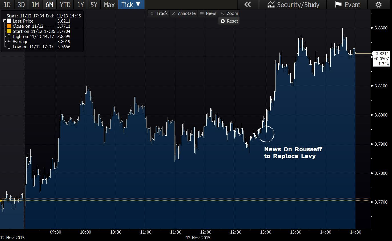 Newspaper Valor Economico’s real-time news service reported that Rousseff has not yet decided on a replacement for Levy, and there is no set date for his exit. The new minister would not be totally autonomous, the news report says without disclosing how it got the information. The currency also declined as slowing credit growth in China weakened the outlook for commodities exporters.
