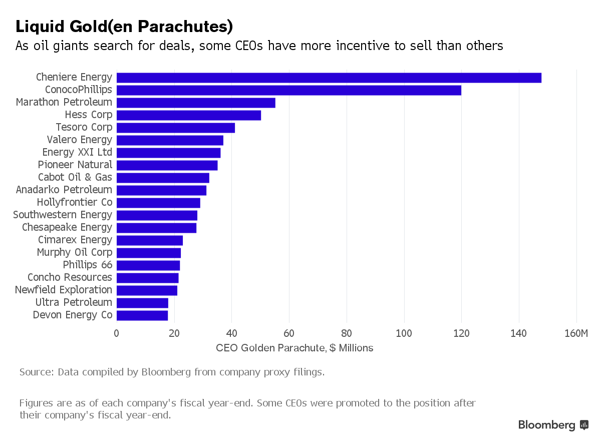 The dollar incentive for takeovers for Apache CEO John Christmann was $8.4 million as of the company’s fiscal year-end when he was chief operating officer, and Anadarko CEO Al Walker’s was $31.2 million as of the end of 2014, regulatory filings show. By comparison, Charif Souki, the CEO of natural gas exporter Cheniere Energy Inc., has a payout of $147.8 million, the highest of 83 U.S. oil and gas companies with a market value less than $45 billion as of their fiscal year-end.