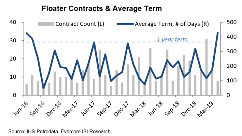 The jackup mix was unchanged at 57%, but Evercore said it was encouraged that average terms lengthened for both jackups and floaters to almost one year for jackups and more than five months for floaters. In 2018, average terms for jackups was six to seven months and less than five months for floaters.