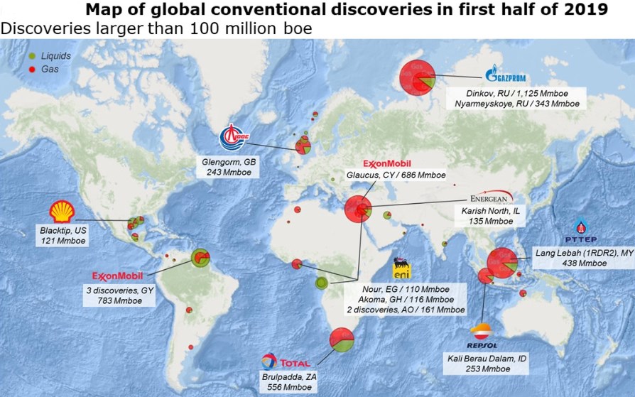 The Norwegian energy research and consultancy said on Thursday that new finds totaled 6.7 billion barrels of oil equivalent (boe) in the first half of 2019.