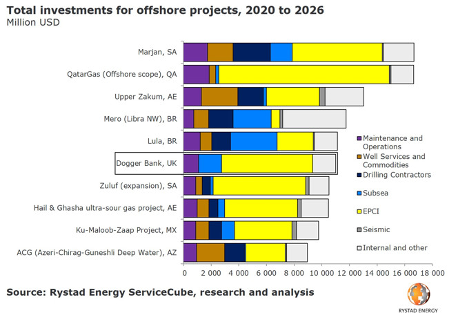 The offshore wind project Dogger Bank in the UK North Sea will not only be Equinor’s largest project through 2026, it will also rank as the sixth largest offshore development project in the world during this period, according to Rystad Energy.