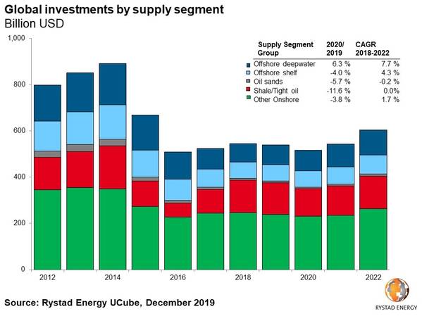 Rystad Energy is forecasting that overall global upstream investments in 2020 will decrease by around 4%. Investments in shale/tight oil are expected to contract the most next year by almost 12%.