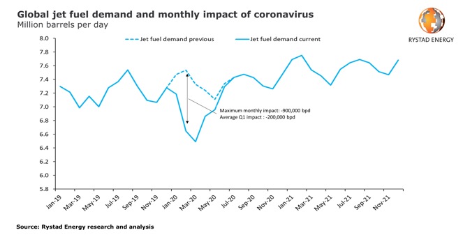The coronavirus epidemic in China has triggered restrictions in the country’s public transport and air travel, both at a domestic and an international level, reducing demand for oil, which has lost about a fifth of its value since the start of the year, according to a latest report by Norwegian energy intelligence firm Rystad Energy.