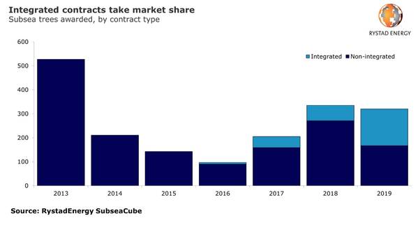 Integrated subsea contracts took center stage in 2019 and had a breakout year with 20 such contracts signed, representing a record-high of over 150 subsea trees awarded under such deals.
