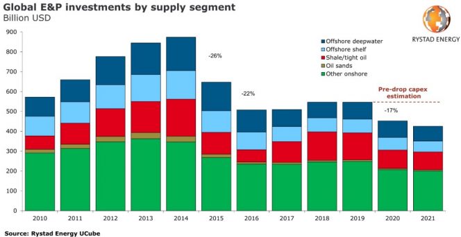 Under Rystad Energy’s updated base case scenario of $34 per barrel in 2020 and $44 per barrel in 2021, global capital expenditure for exploration & production firms is expected to drop by up to $100 billion this year, about 17% versus 2019 levels.