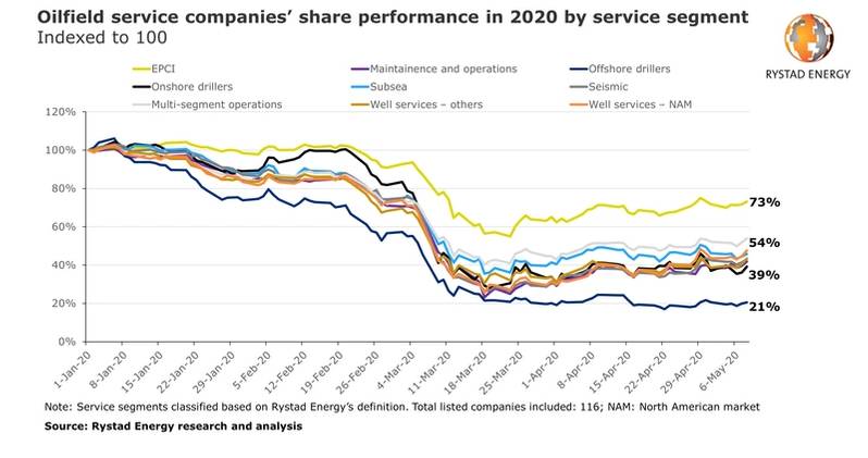 Oilfield services companies have collectively lost almost half of their market capitalization, hit by the combination of the coronavirus pandemic and low oil prices, with offshore drillers, in particular, the most affected, Norway’s Rystad Energy has said in its analysis released on Friday.