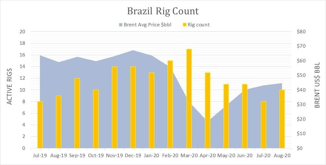 It is anticipated that Brazil’s oil production will keep expanding at a solid clip as major offshore projects are developed and come on-line. The International Energy Agency believes that the Latin American country will deliver one of the largest increases in global petroleum supply from countries outside of the OPEC cartel by 2025. If Brazil’s rig count is used as an indicator of industry activity it is possible to see that the tempo of operations is rising. By the end of August 2020, Baker Hughes data shows there were 10 operational rigs, two greater than July and one higher than for the same month in 2020. The volume of operational rigs is trending higher after reaching its lowest number for the last year in July.