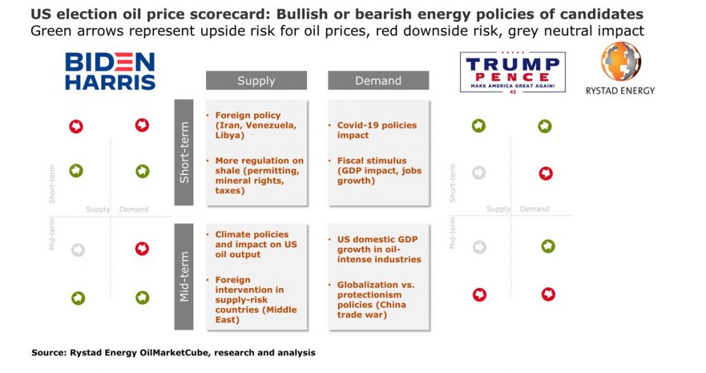 Bjornar Tonhaugen, Head of Oil Markets at Rystad Energy, said: “We see a short-term price volatility -bearish for Biden, bullish for Trump – but above all, we expect the election to be a milestone, a sigh of relief, after which the oil market will reorient itself to the larger structural macro weakening and the increasing likelihood of a second, yet milder, wave of Covid-19 oil demand destruction”.