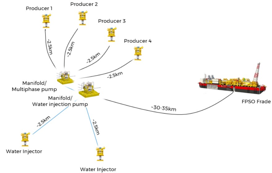 The Wahoo base project covers the drilling of four producer wells, two injector wells, the deployment of a subsea manifold with multiphase pumps for the flow of oil and injected water and the tieback between the manifold and the Frade FPSO.