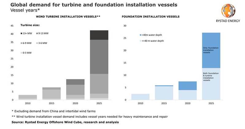 On the supply side of the equation, there are currently 32 active turbine installation vessels (five more have been ordered) and 14 dedicated foundation installation vessels (another five have been ordered), Rystad said.