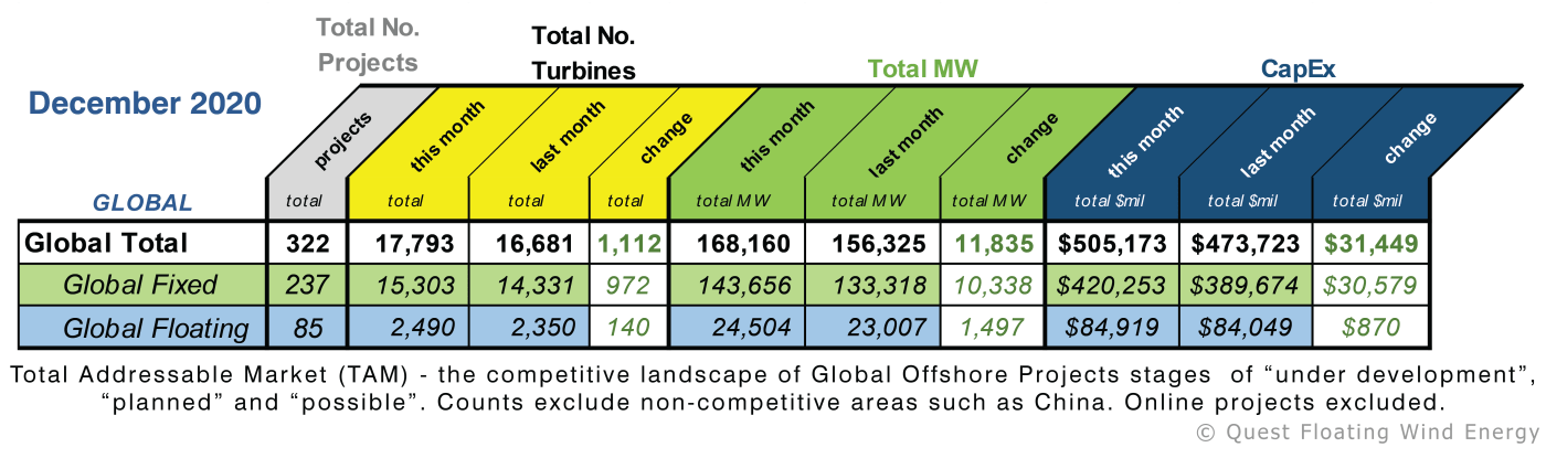 The Quest Offshore Wind Turbine Index (QOWTI), which tracks the Total Addressable Market for offshore wind*, shows 322 global projects for December a gain of 28 projects since September, comprising 17,793 individual turbine units representing a CapEx of $505.2 billion. Although Asia Pacific continues to lead Europe in total project count, Europe leads all regions in total CapEx and MW density at $210.2 billion and 69.2 GW, respectively, compared to $174.8 billion and 56.5 GW in Asia Pacific which ranks second.