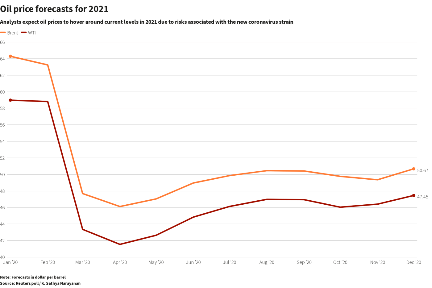 West Texas Intermediate (WTI) U.S. crude futures are expected to average $47.45 per barrel in 2021, the poll showed.