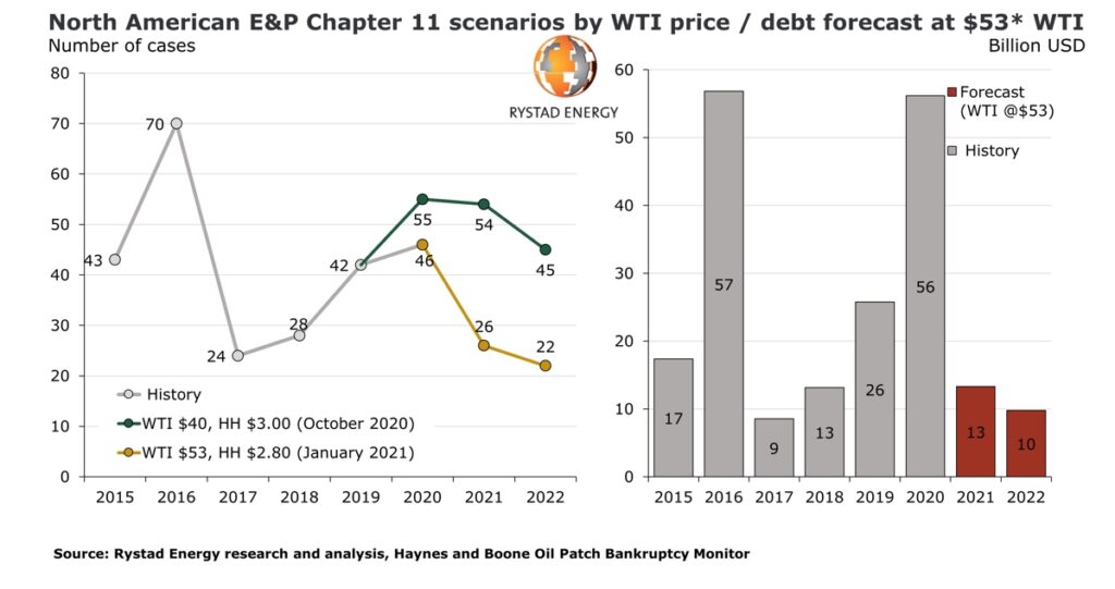 After the costliest Chapter 11 year in history, 2021 bankruptcy numbers will normalize if WTI keeps up, an analysis by Norwegian energy intelligence firm Rystad Energy has shown.