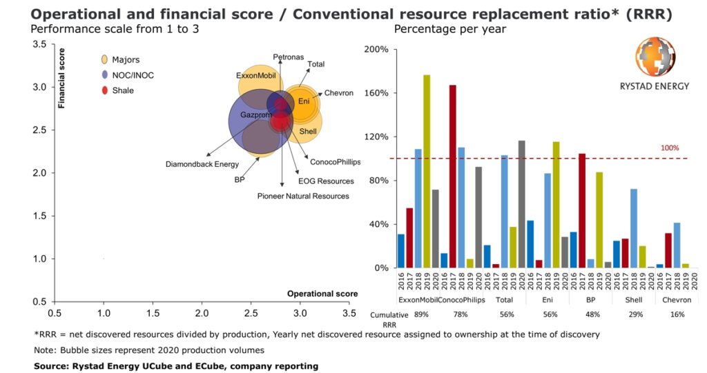 In Rystad’s operating performance scorecard, on a scale of 1 to 3, Total got the highest score (3) together with Eni, Chevron and Shell. Total, Eni, Chevron and others also score a high 2.8 in financial performance, though they are all beaten by ExxonMobil which scores 3 in this category.