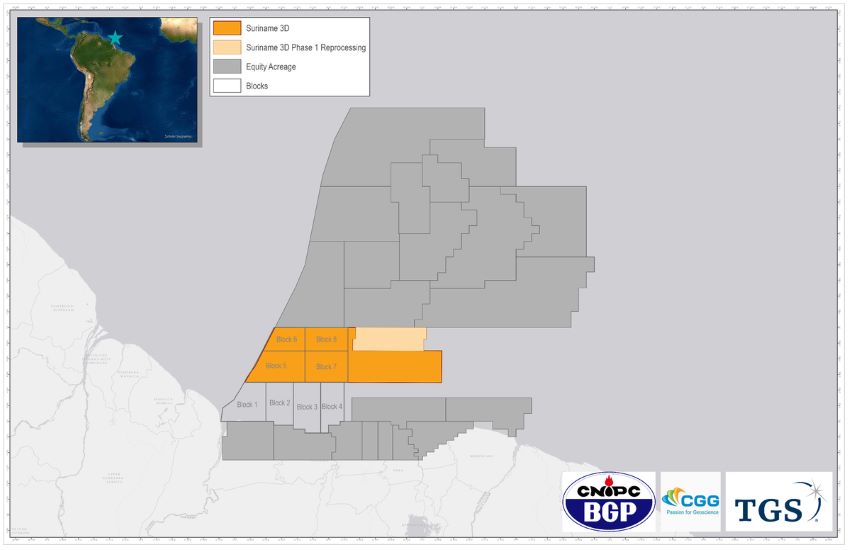 A consortium of TGS, CGG and BGP has commenced the acquisition for Phase 1 of the Suriname 3D project.