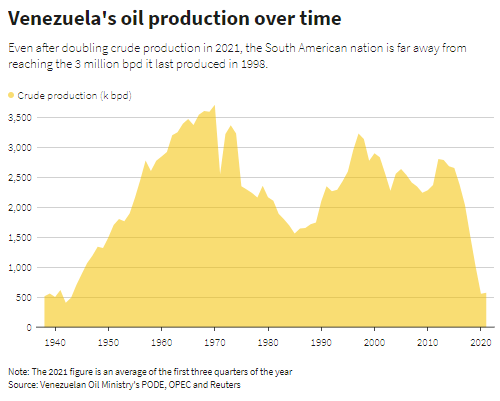 Even after doubling crude production in 2021, the South American nation is far away from reaching the 3 million bpd it last produced in 1998.