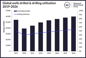 Westwood expects many regions to recover from the dramatic global downturn throughout 2020 better than previously expected. In 2020, levels reached a low of c.39,000 wells drilled onshore globally, but activity in 2022 is expected to reach 49,600 before climbing to c.60,000 wells in 2026.