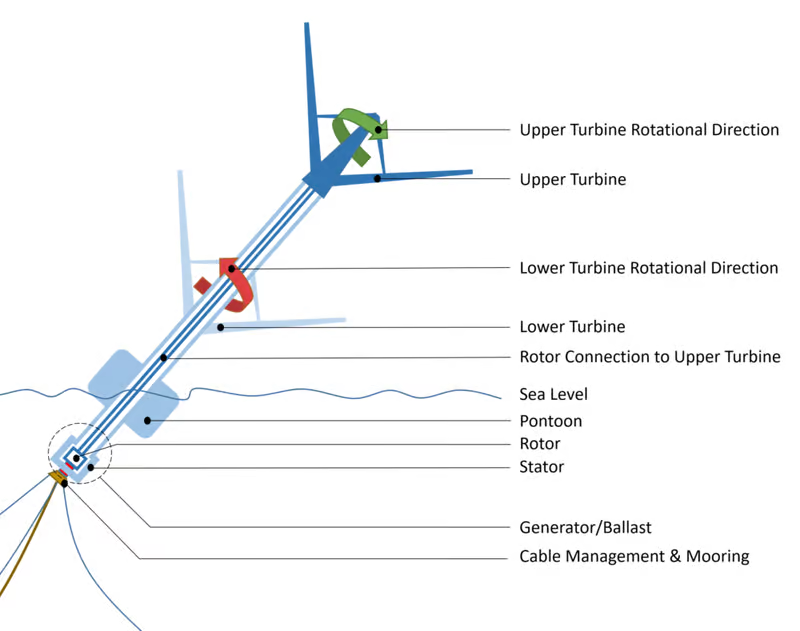 Under the surface, one turbine is fixed to the rotor, the other to the “stator,” doubling the relative speed of rotation as compared to a static stator, and generating a whole bunch of electricity we can burn our toast with. The company calls this a contra-rotating vertical turbine, or CRVT.