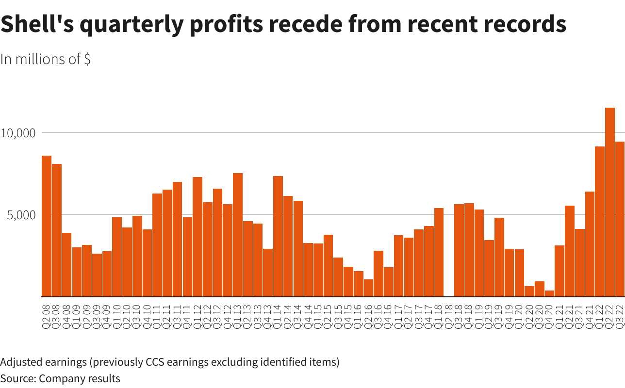 The quarterly adjusted earnings of $9.45 billion, which slightly exceeded forecasts, were hit by a sharp 38% quarterly drop in the gas and renewables division, Shell’s largest.
